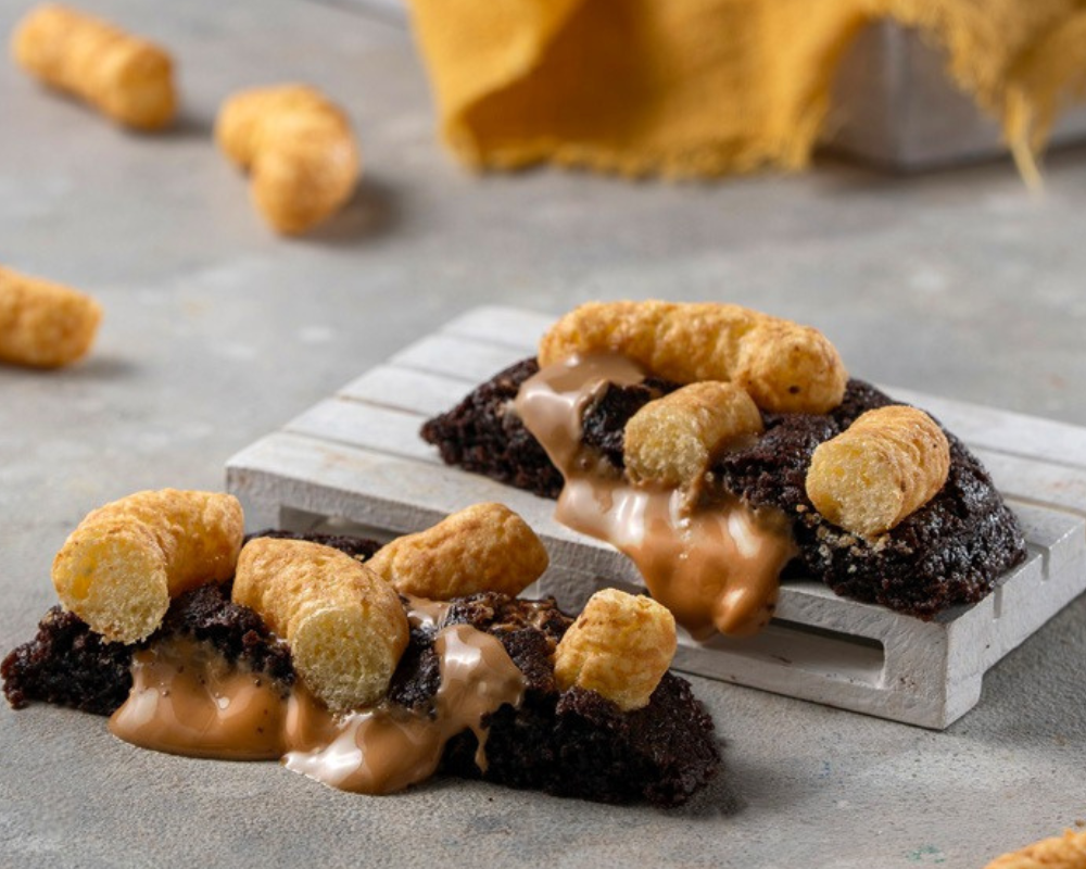 عجينة كاكاو فيها قطع شوكولاتة حليب وبيضاء محشية لوتس وعلى الوجه شوكولاتة كندر ماكسي