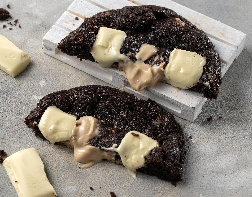 عجينة كاكاو فيها قطع شوكولاتة حليب وبيضاء محشية أوريو وعلى الوجه شوكولاتة بيضاء